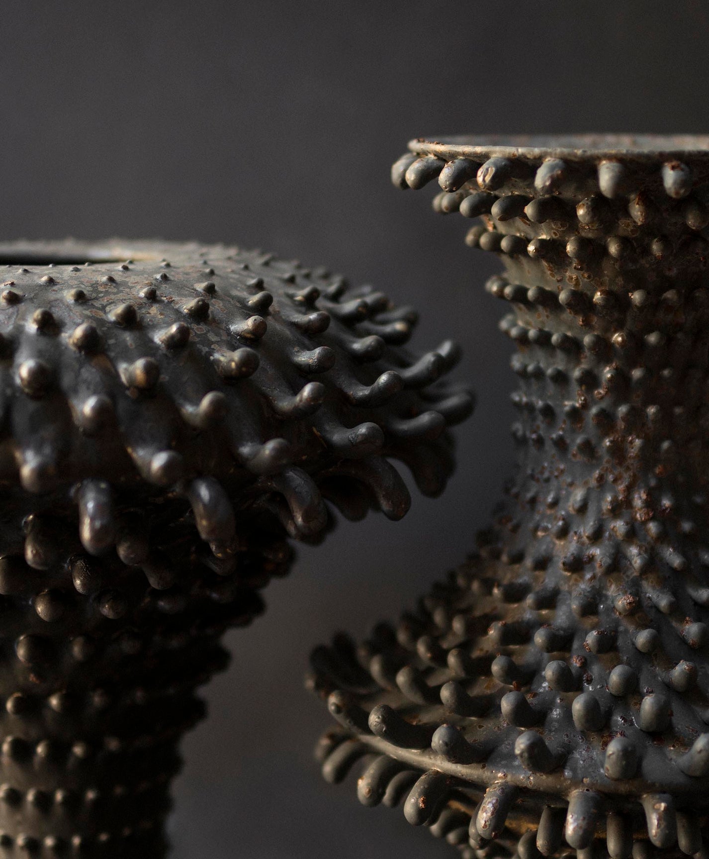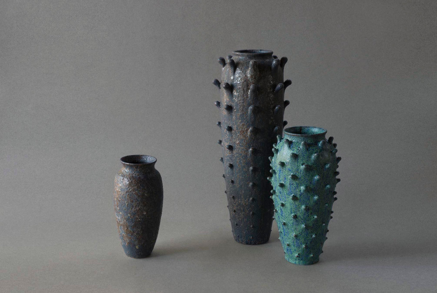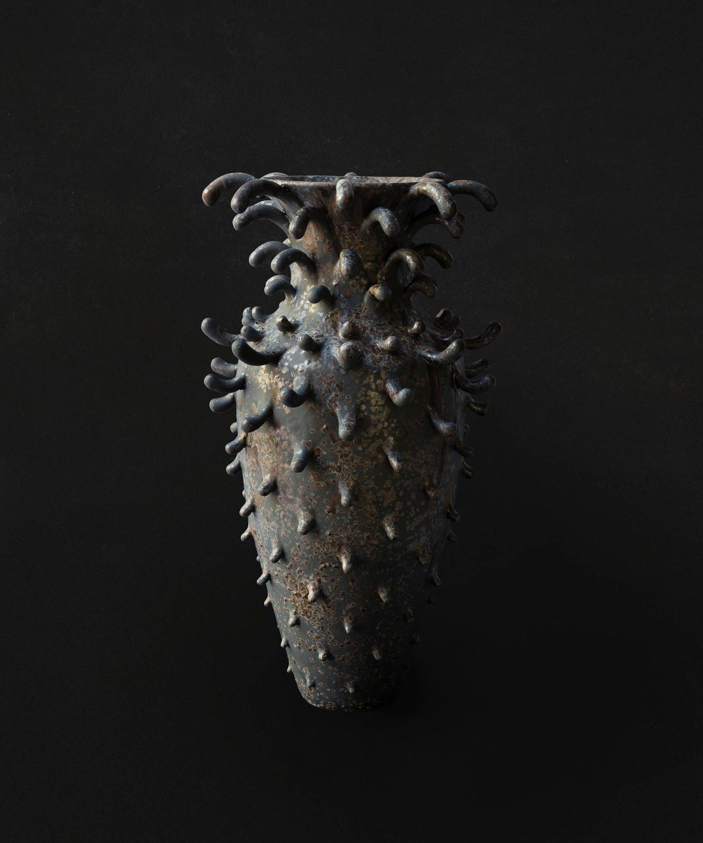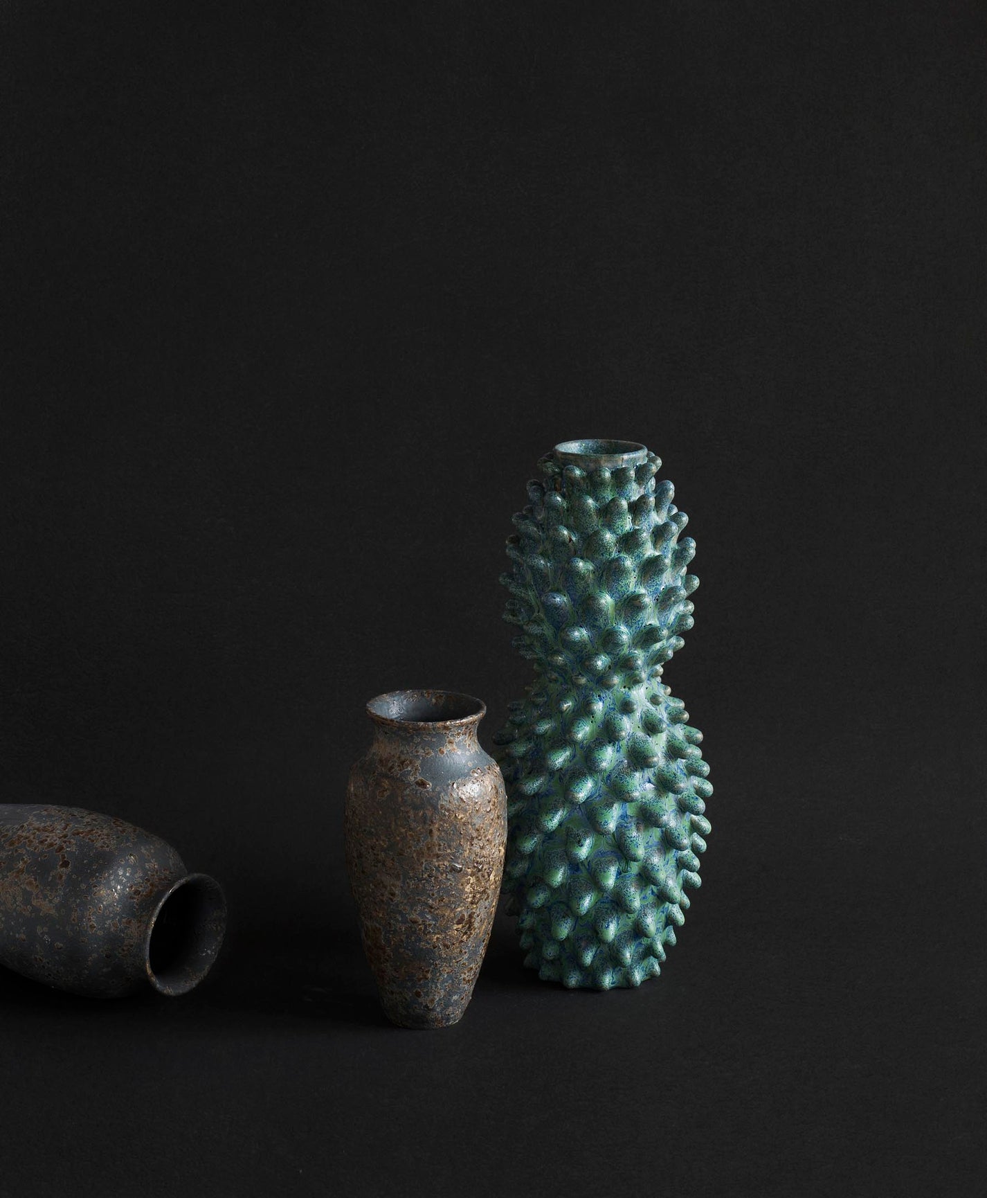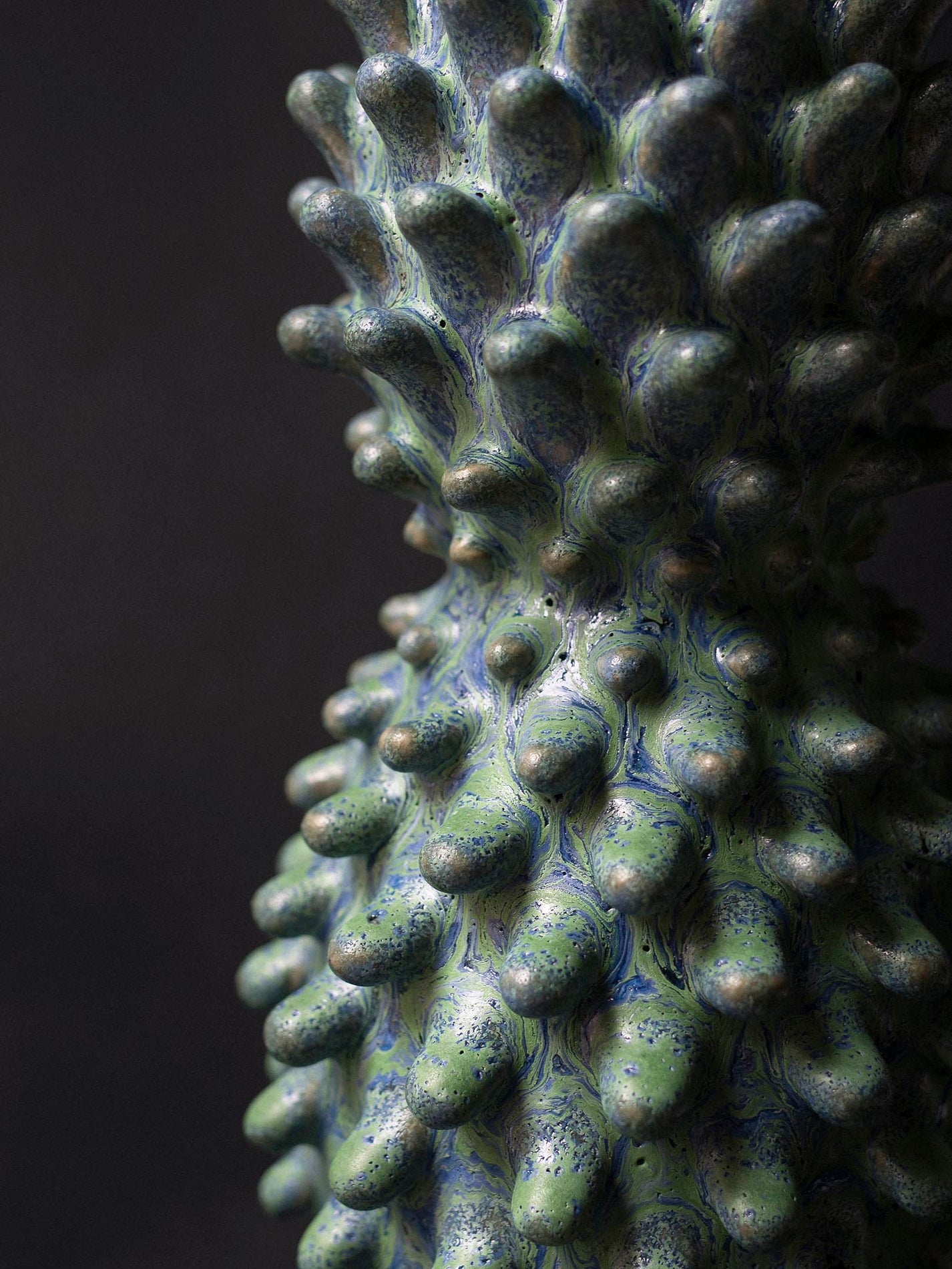 With individually sculpted protrusions applied to a single vessel by hand, the forms are an exercise in control and precision. In contrast, the surface finish is left more to chance, with multiple glazes and other organic materials layered over each other resulting in surfaces that look geological, primeval, or even extra-terrestrial.