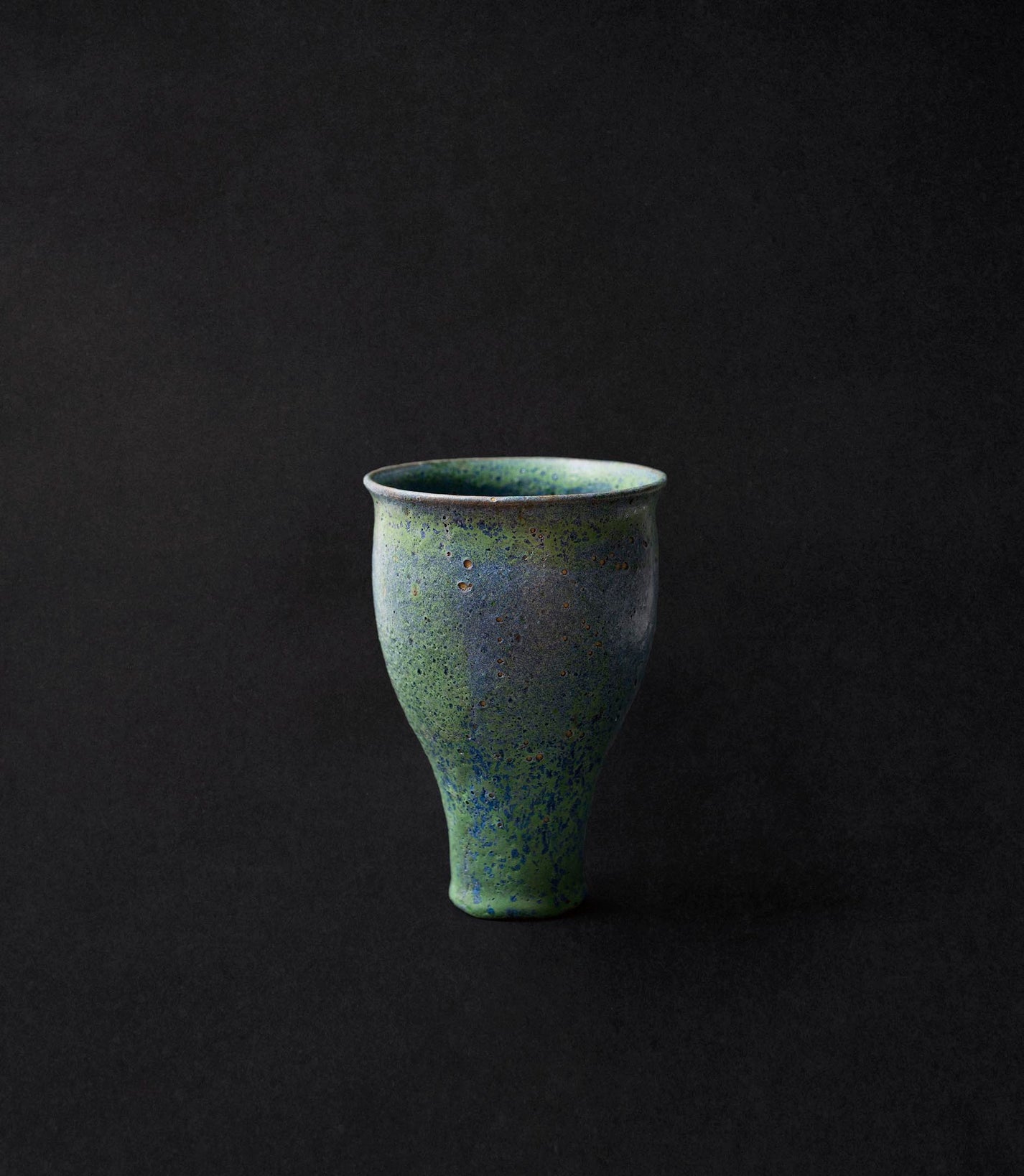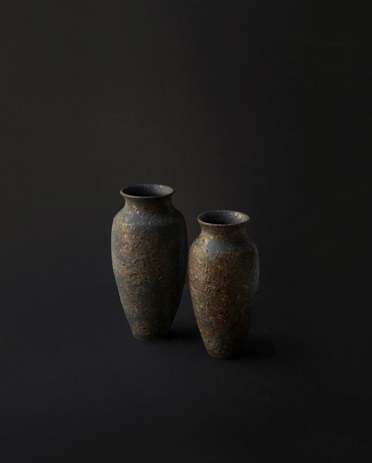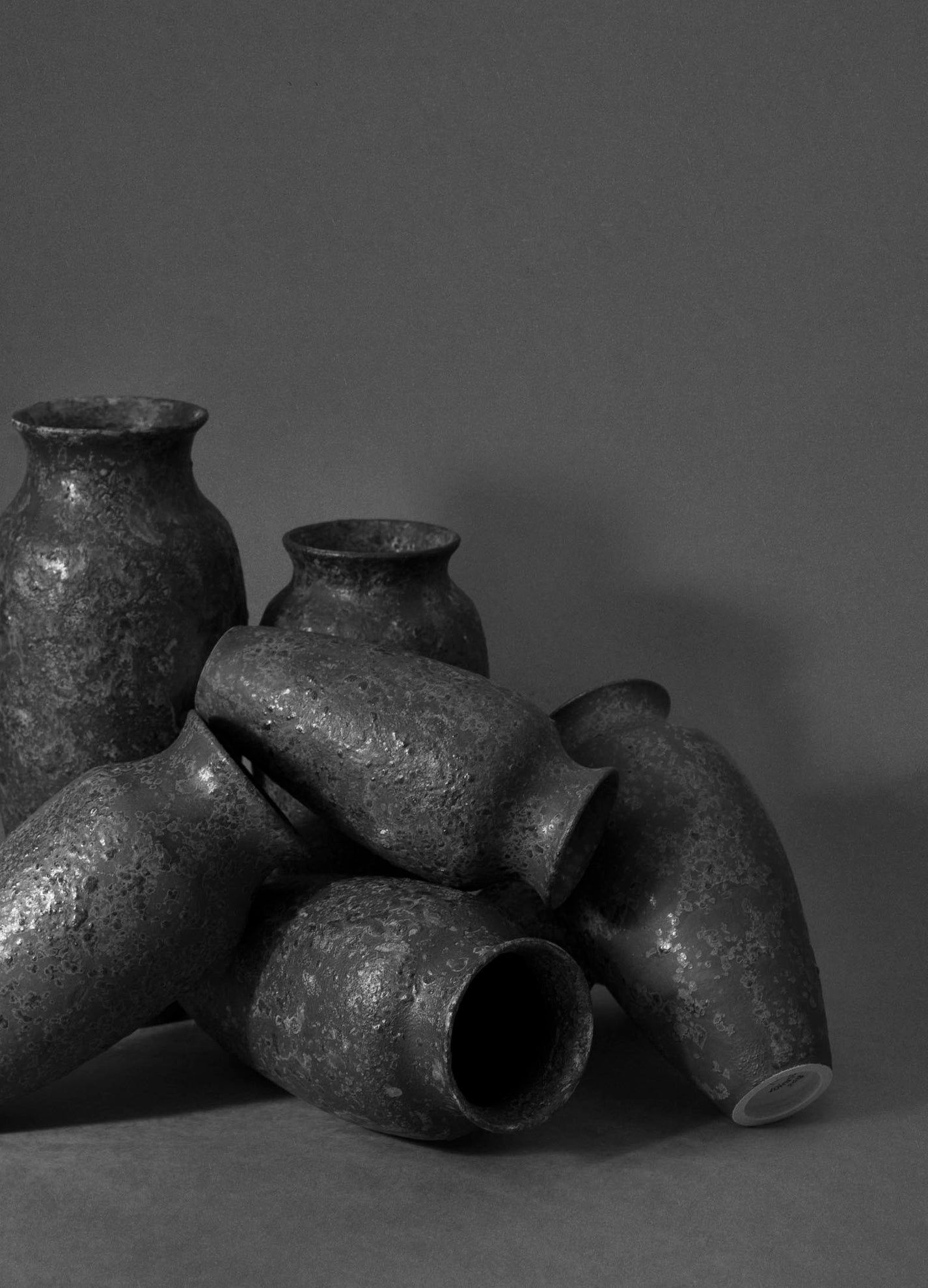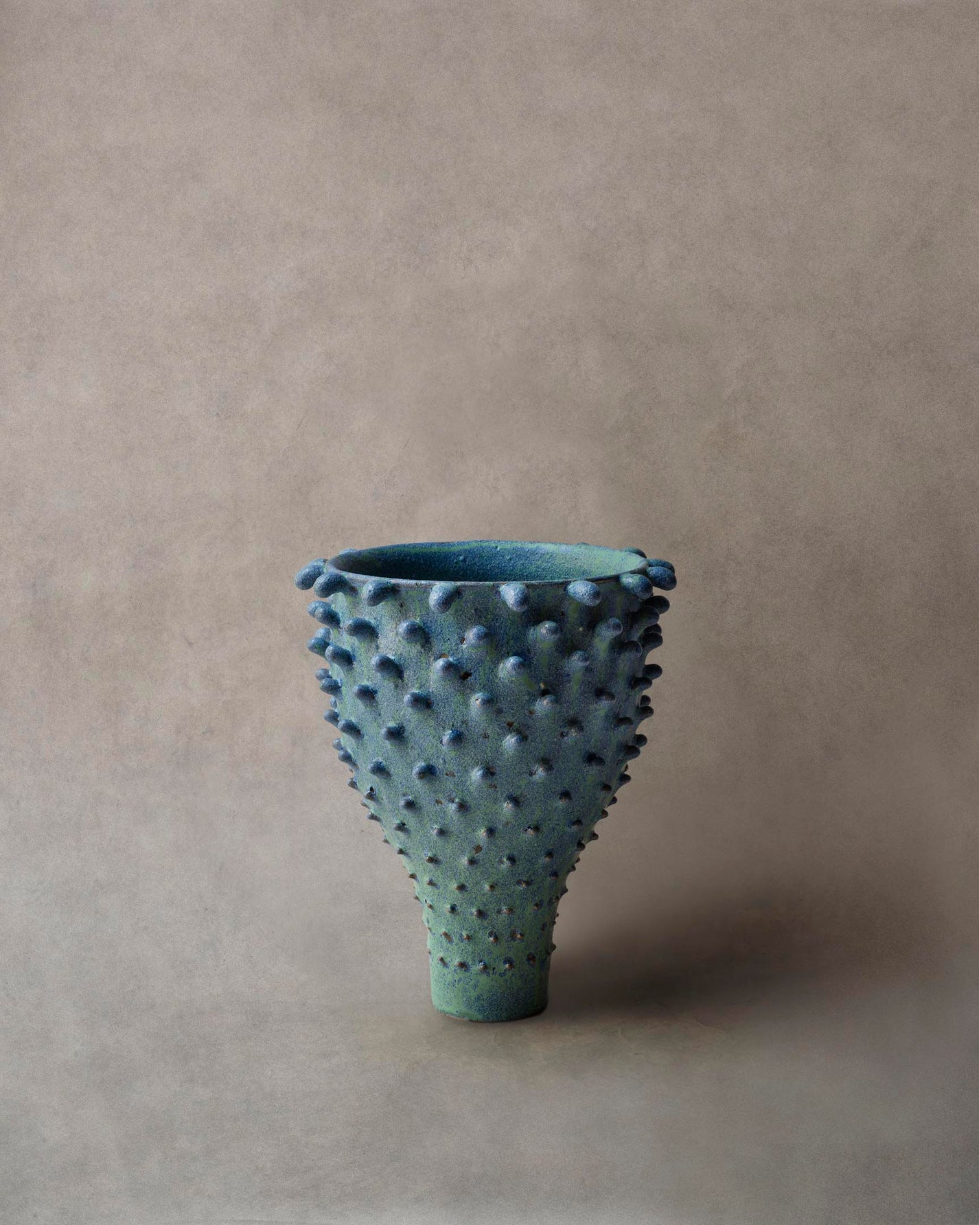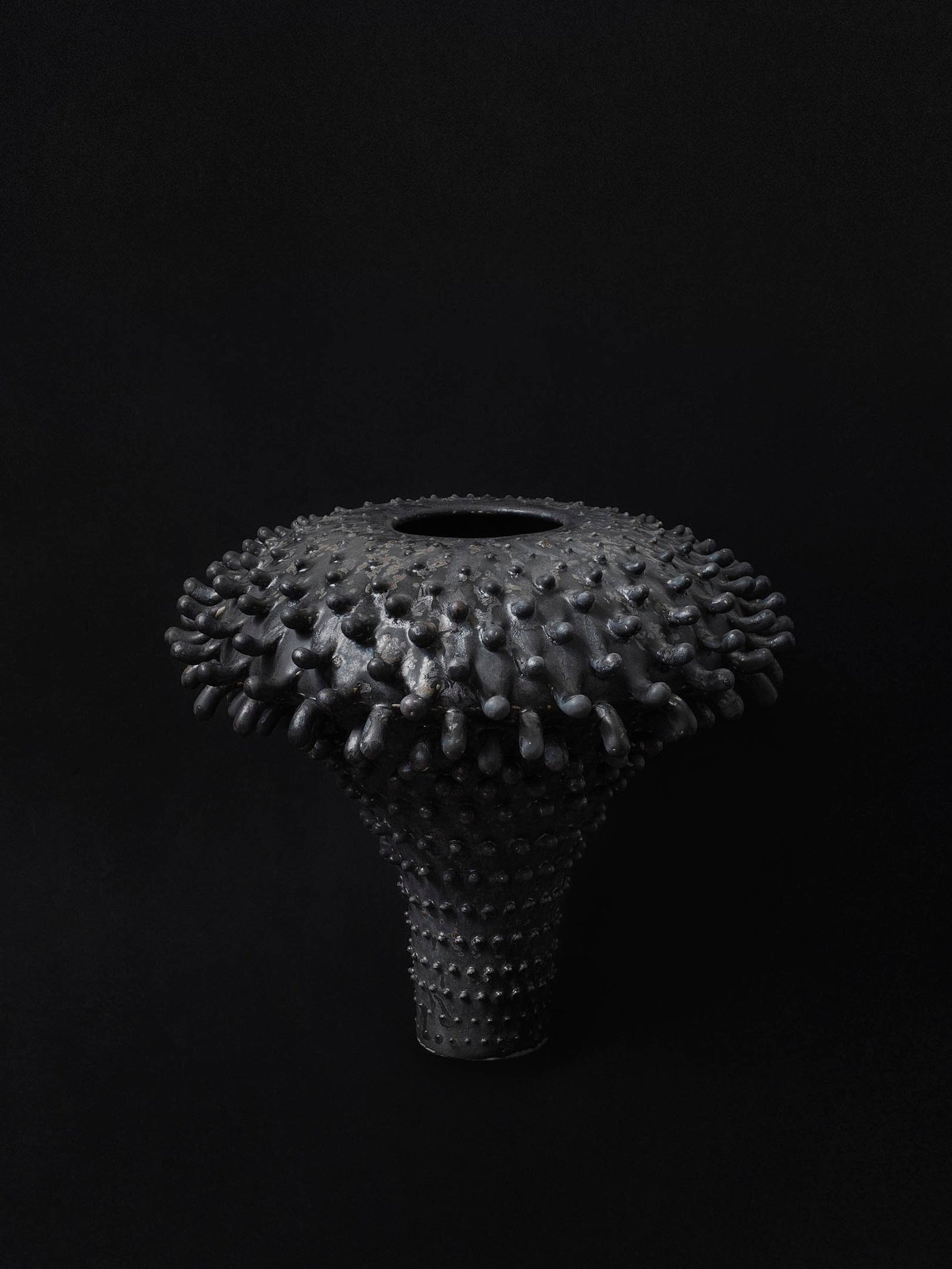 With individually sculpted protrusions applied to a single vessel by hand, the forms are an exercise in control and precision. In contrast, the surface finish is left more to chance, with multiple glazes and other organic materials layered over each other resulting in surfaces that look geological, primeval, or even extra-terrestrial.